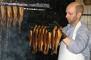 Herzstück des Hofes ist der steinerne Räucherofen, in dem der Fisch über offenem Buchenholzfeuer nach alter Tradition geräuchert wird.